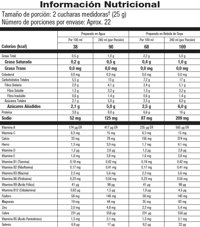 Agita suavemente el envase varias veces antes de abrirlo. Mezcla o revuelve 2 cucharas medidoras† (25 g) de Fórmula 1 con un vaso (240 ml) de bebida de soya ¡Y disfrútalo! También puedes prepararlo con agua o personalizar tu Fórmula 1 agregando fruta fresca, hielo, u otros alimentos.