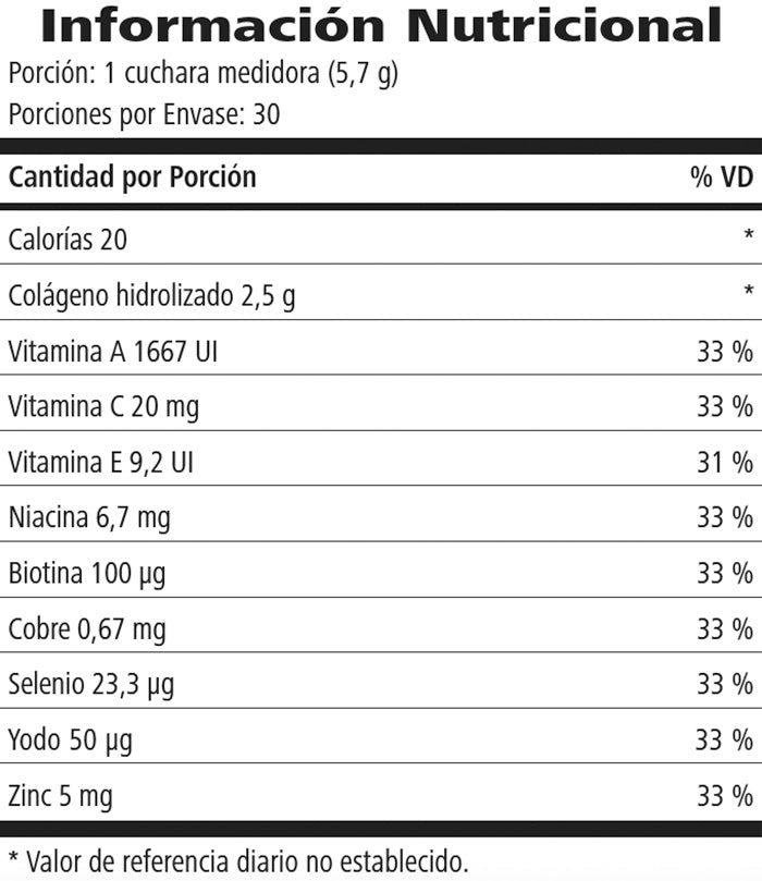 Suplemento dietario a base de colágeno con vitaminas y minerales. Su fórmula contiene Colágeno hidrolizado Verisol®*, también las vitaminas A, C y E. Cobre, Selenio, Yodo y Zinc. Biotina, Niacina Libre de Gluten.